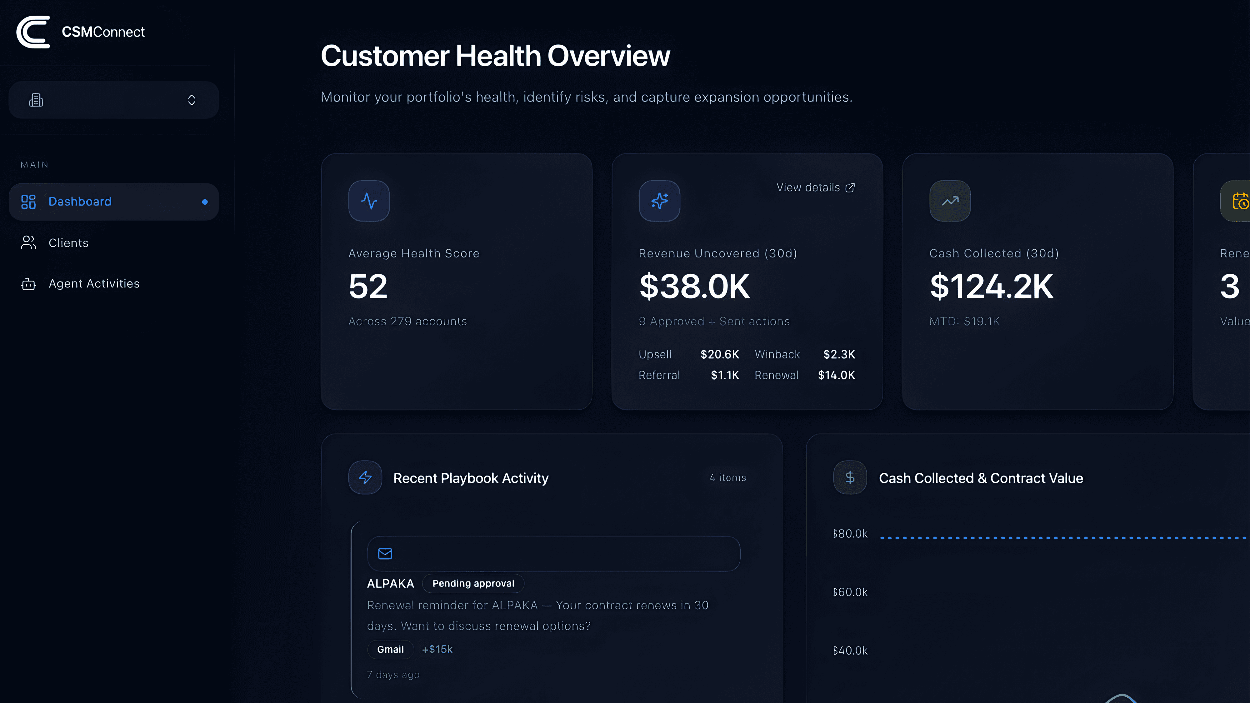 CSMConnect inserts an AI-Enabled Customer Success Manager into your SaaS that identifies missed revenue (upsells, win-backs, referrals, churn alerts), sequences perfectly timed outreach, and runs 24/7 follow-ups—without adding headcount.
